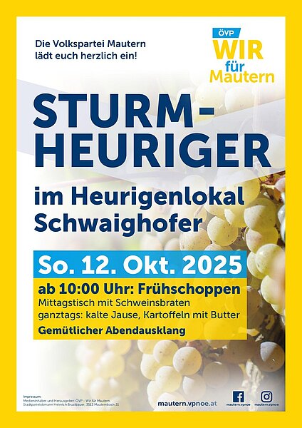 Kommt uns bei unserem Sturmheuriger am 12. Oktober 2025 ab 10:00 Uhr beim Heurigenlokal Schwaighofer besuchen!